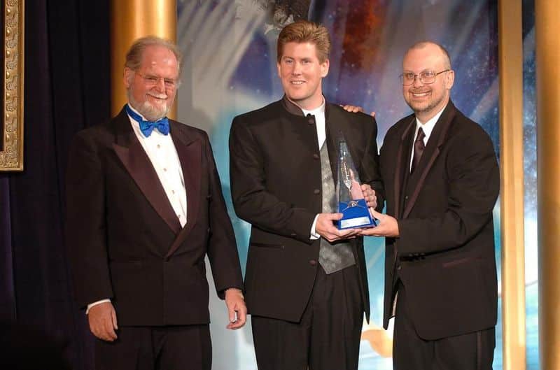 Jason receiving his award from Larry Niven and Robert Sawyer.
