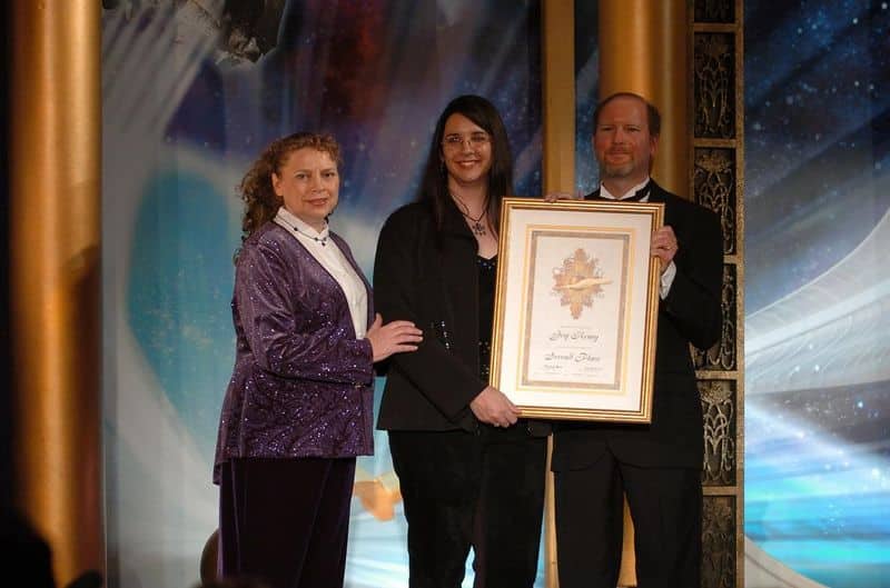 Joy receiving her award from K.D. Wentworth and Kevin J. Anderson.