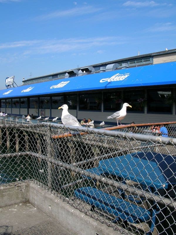 Some gulls and a fire engine ship.