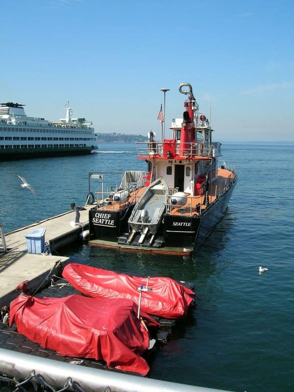 Some gulls and a fire engine ship.