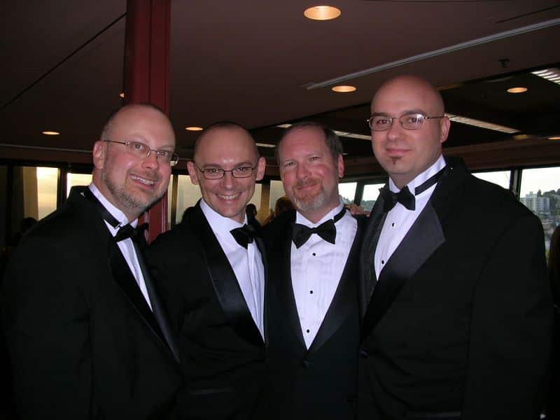 Barbershop quartet The Penguins: Robert Sawyer, Sean Williams, Kevin J. Anderson, and Mike.