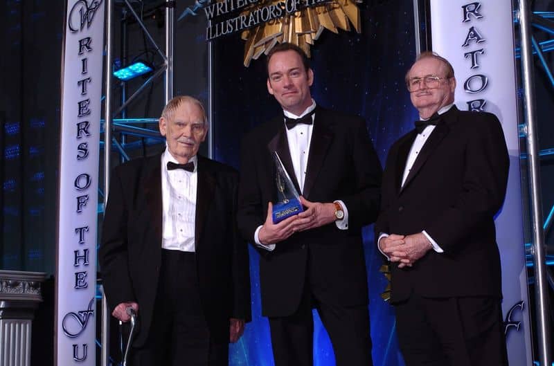 Posing proudly between Frederick Pohl and Jerry Pournelle.